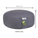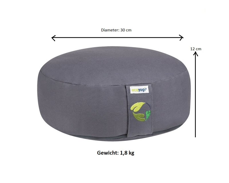 Het Ecoyogi meditatiekussen rond laag grijs is gemaakt van een stevig 100% GOTS gecertificeerde ecologische canvas katoen. Het kussen heeft aan de onderzijde een rits waardoor deze gemakkelijk is te openen. Dit maakt het heel eenvoudig om de buitenhoes te wassen of om de vulling van het binnenkussen aan te passen aan de gewenste zithoogte. De rits van het binnenkussen is zo geplaatst dat het mogelijk is om de vulling te verwijderen of toe te voegen. Het meditatiekussen heeft een stevig handvat waardoor deze gemakkelijk is te verplaatsen of te vervoeren.