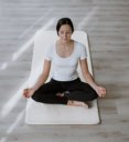 Onder de wollen yogamat heb ik de aubergine mat liggen, die geeft nog meer warmteisolatie en demping voor mijn slechte knieën en heupen.